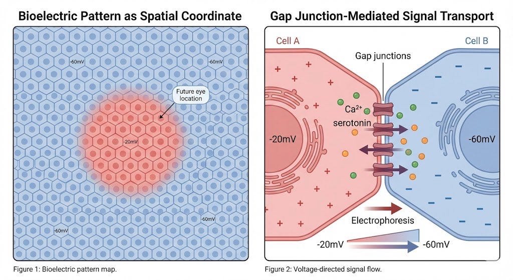But how do cells know what their neighbors are doing? The answer are the physical tunnels that connect adjacent cells and allow ions and small molecules to flow freely between them, called gap junctions. If Cell A is at -20mV and Cell B is at -60mV, there’s a voltage gradient between them. This gradient physically pushes charged signaling molecules (like serotonin or calcium) from one cell to another through those tunnels, a process called electrophoresis. In other words, voltage directs traffic. It controls where the signals go.