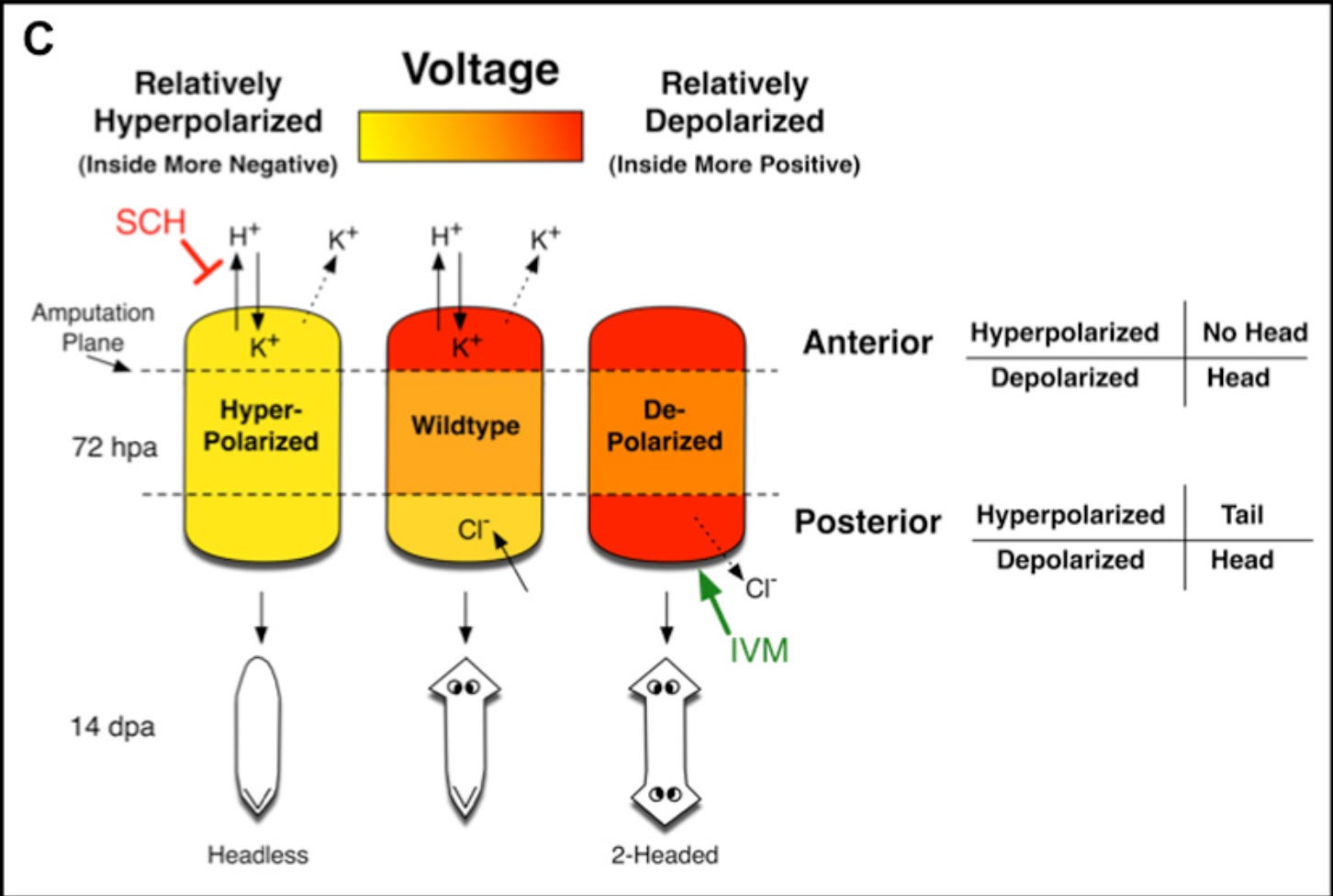 From their paper: “Wildtype fragments have a membrane potential gradient with the head blastema most depolarized and the tail blastema least depolarized. SCH-mediated H,K-ATPase inhibition results in relative hyperpolarization and ivermectin treatment in relative depolarization. Hyperpolarized blastemas become either tail or headless, while depolarized blastemas always result in head formation. IVM=ivermectin, hpa=hours post amputation, dpa=days post amputation.”