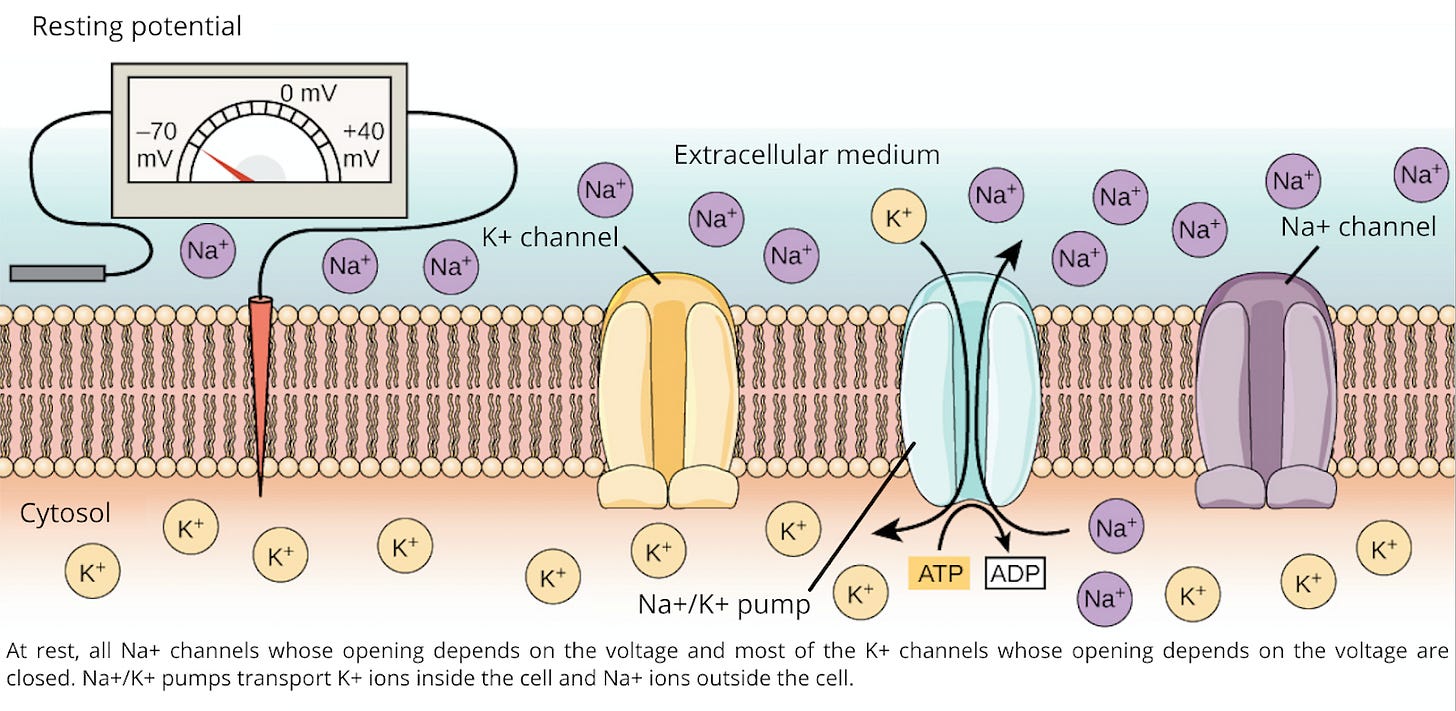 Going back to your high school biology, there is an important concept which is that in most cell types, cells exist in a resting state where the inside of the cell membrane is slightly negative relative to the outside, typically around -70 millivolts. This voltage difference, called the resting membrane potential, is maintained by ion pumps and channels that carefully regulate the flow of sodium, potassium, calcium, and chloride across the membrane.